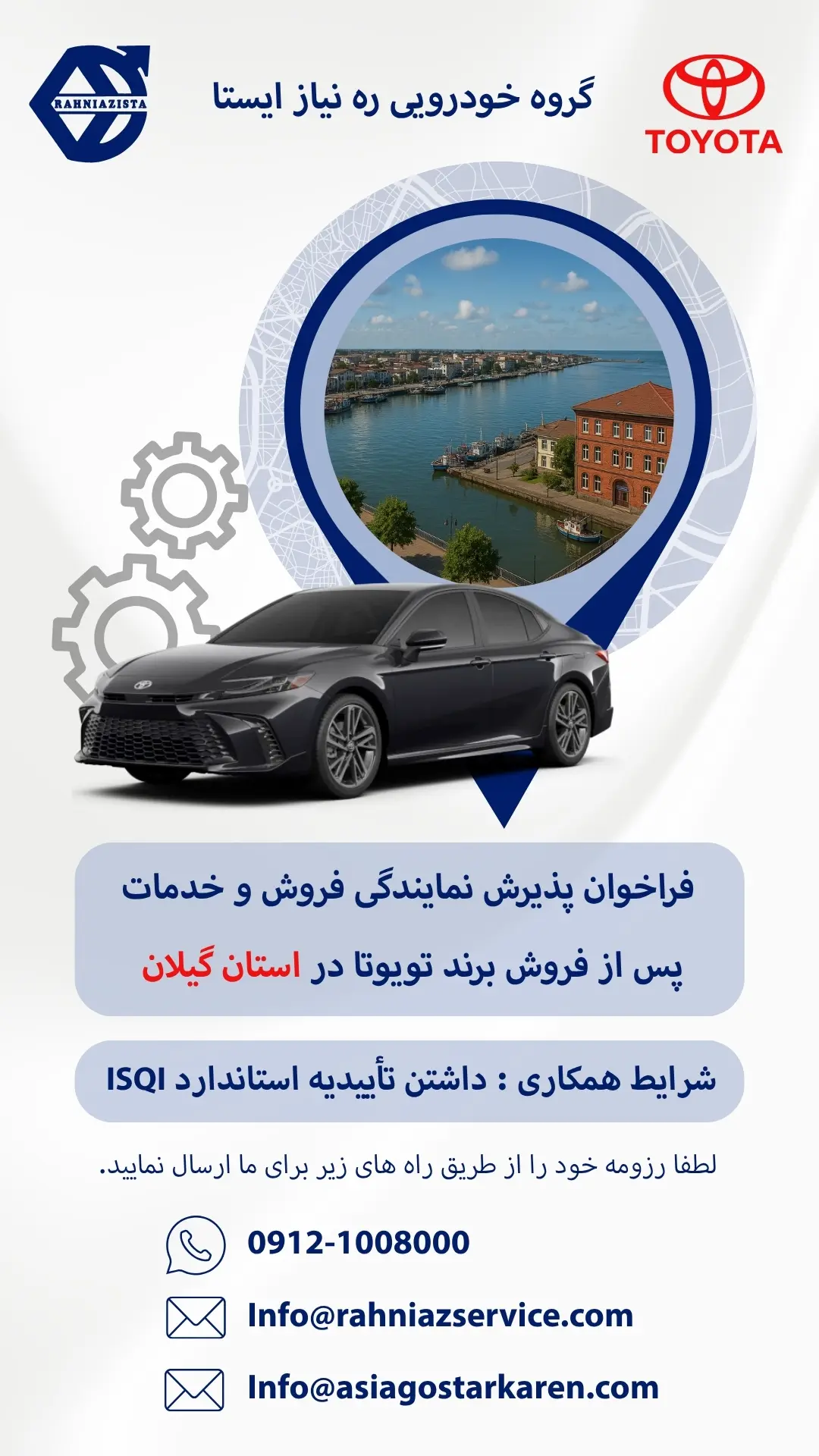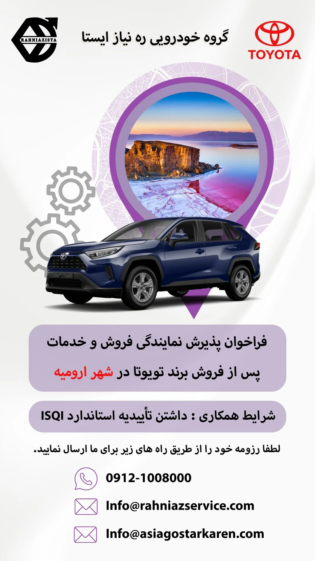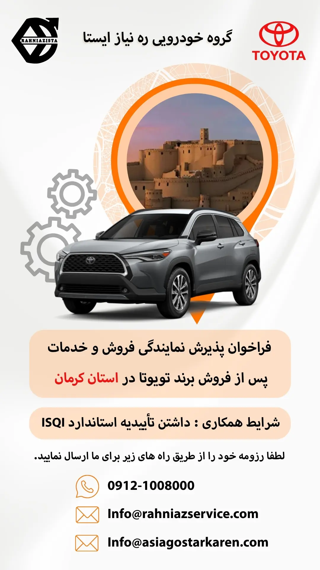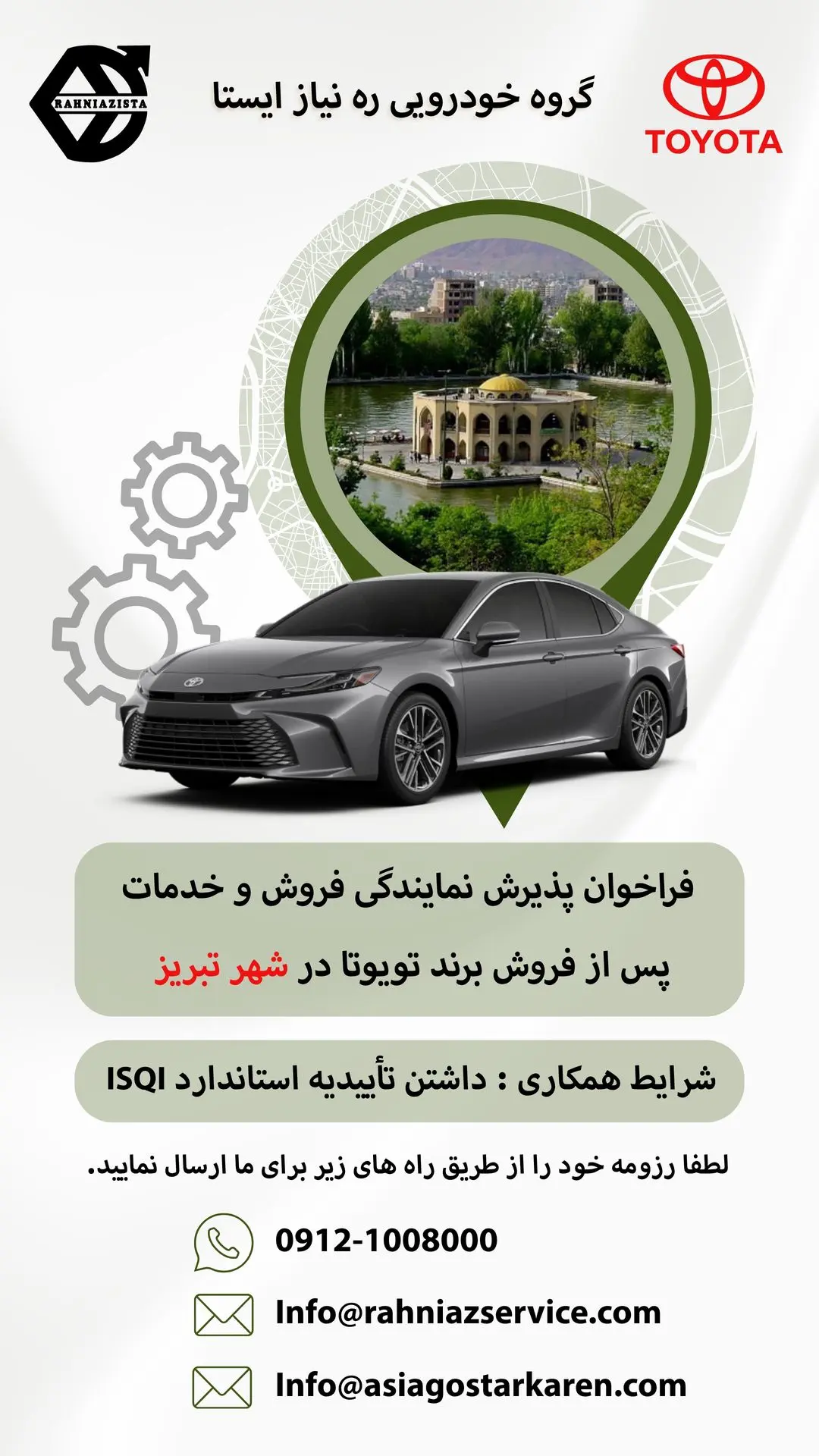 شرکت گروه خودروسازی ره نیاز ایستا، نماینده فروش و خدمات خودروهای تویوتا در ایران، با افتخار فراخوان پذیرش نمایندگی خود را اعلام میکند. اگر شما علاقهمند به همکاری هستید، این فرصت ویژه را از دست ندهید. ما به دنبال نمایندگانی متعهد، متخصص و باتجربه در زمینه فروش و خدمات خودرو هستیم که بتوانند خدماتی باکیفیت به مشتریان ارائه دهند.